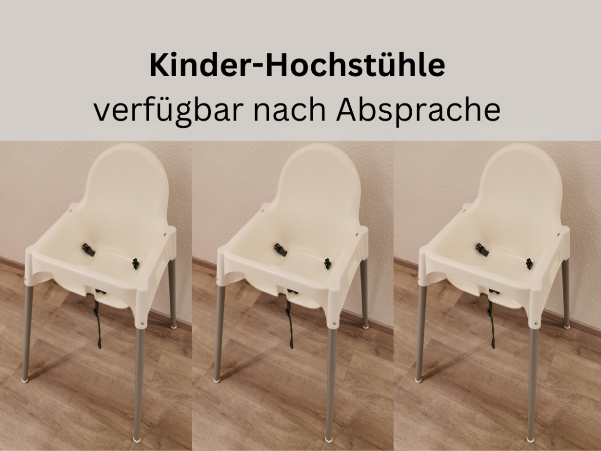 Kinder-Hochstuhl und Reisebett (auf Wunsch), Bücher- und Spieleauswahl (auf Wunsch), Kinder-Geschirr,